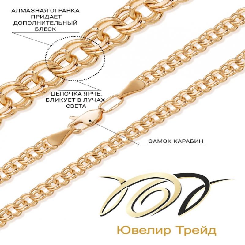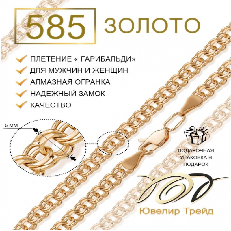 Цепь пустотелая, золото 585 пробы от производителя - лидера ювелирной отрасли (завод "Ювелир Трейд", г. Кострома). Самое популярное плетение на территории России. Плетение Гарибальди (Бисмарк) относится к так называемому якорному типу. Украшения, произведенные в такой технике, очень долговечны, а вероятность разрыва минимальная, это преимущество напрямую связано с равномерным распределением нагрузки по всей плоскости касающихся фрагментов элементов цепи и на все звенья. Для придания более оригинального и эстетичного вида проводится алмазная огранка. Цепочка подходит как подарок любимой девушке, мужчине, женщине. Поводом для подарка может быть День Рождения, Новый год, День матери, годовщина свадьбы, 8 марта, 14 февраля, 23 февраля. Изделие прошло клеймение в Российской Инспекции Пробирного Надзора. Значение веса в характеристиках является примерным и может незначительно отличаться от фактического. Ширина изделия 5 мм. Бисмарк цепь, бисмарк, цепочка бисмарк, цепочка золотая мужская бисмарк, цепочка золотая женская бисмарк, цепочка на шею, цепочка, цепь на шею, цепочка мужская, парные цепочки, цепь на шею, цепь, цепь мужская, цепь женская, цепь на шею мужская, золотая цепь, цепочка на шею, цепочка, цепочка мужская, золотая цепочка, цепочка женская, цепочка золотая, цепочка на шею мужская, цепочка на шею женская, золотая цепочка, золото, золото 585, золотые цепочки из золота 585, цепь женская золотая, золотые, цепочки из золота, цепочка золотая женская 585, золотая цепочка 585 пробы, цепь золотая мужская 585 пробы, золото 585 пробы цепочки, цепочка на шею, женская золото, колье, цепи, шнурки, цепочка на шею золото Развернуть описаниеОписание