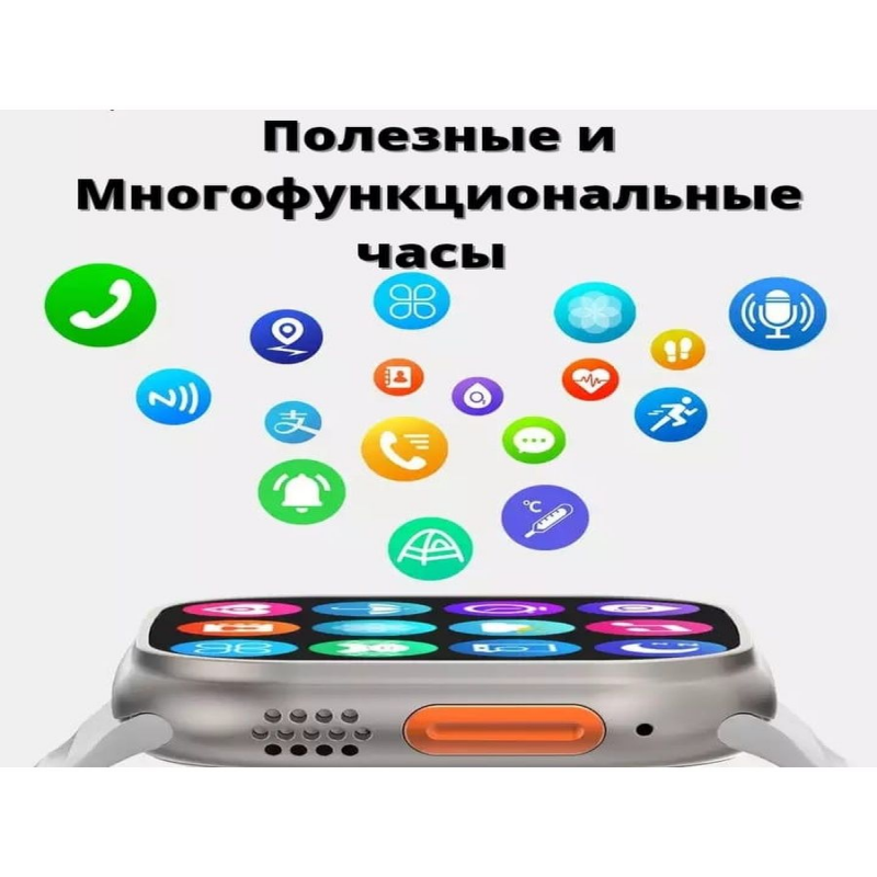 Smart Watch 8 ULTRA новинка 2022-2023 года. Смарт Часы 8 серии / Watch 8 ULTRA Premium версия. Процессор стал ещё мощнее. В наличии цвета: Черный, Золотой и Серебро. Приложение Wearfit Pro (более 500 бесплатных циферблатов на выбор). Основные отличия Смарт часов 8 Ультра от 7 серии – это наличие безрамочного AMOLED экрана 2.02 дюйма. В данной версии корпус выполнен из цинкового сплава. Версия Bluetooth - 5.2. Уровень водонепронецаемости IP68. А так же увеличен объём батареи! Смарт часы женские, детские для взрослых мужчин, это стиль в современной жизни. Подходят для apple IOS и Андроид. Часы наручные мужские включают в себя часы шагомер браслет давление, браслет здоровья с измерение давления, часы для детей с gps и телефоном, часы с измерением артериального давления, часы с тонометром наручные для тренировки, электронные часы с термометром, часы с компасом, часы с секундомером. Фитнесс браслет на руку женский универсальный, станет помощником на повседневное ношение, для занятий спортом, велосипедные аксессуары. Время работы у вотч часов хватит надолго, до полной разрядки. Циферблат для часов выполнен из прочных материалов. Ручные часы сенсорные совершают звонки, уведомления о смс, мониторинг сна, кардио тренировки, управление музыкой. Электроные часы идеальный подарок на день рождения девушке, маме, сестре, часы для мальчика, папы, брата. Часы для айфона и смартфона не являются медицинским прибором. Смарт часы, Фитнес браслет, 7 серии, часы для мужчин, женские часы, браслет, смарт часы 8 серии. Развернуть описание