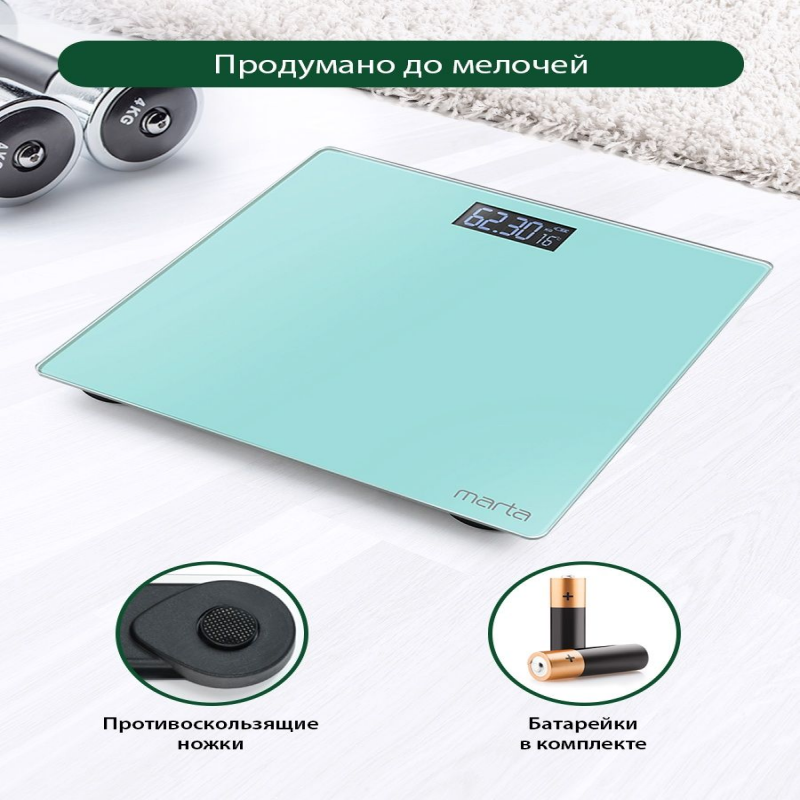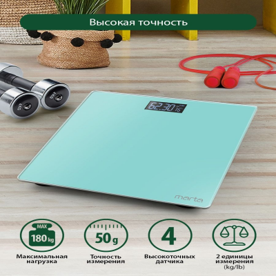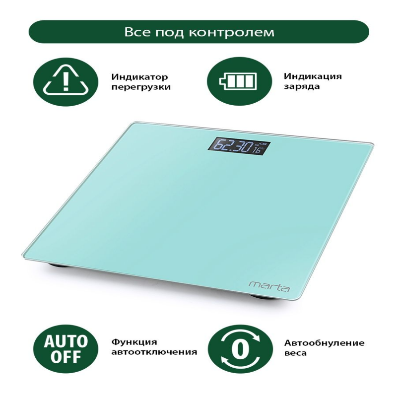 Весы напольные электронные стеклянные с термометром MARTA, для похудения, для фитнеса, для мужчин и женщин. Дисплей ЖК, Диапазон измерений 5-180 кг, Точность измерения 50 г, Индикация заряда батареи, Индикация перегрузки, Измерение ТЕМПЕРАТУРЫ воздуха, Режимы только масса тела, Изменение единиц измерения, Единицы измерения кг/фунты, Светящиеся символы дисплея, Размер дисплея 24х60 мм, Тип элементов питания AAA, Количество элементов питания 2, Напряжение элементов питания 1,5 В, С рисунком на корпусе, Автоматическое включение, Автоматическое выключение, Материал платформы стекло.Электронные напольные весы с платформой из полированного стекла 26х26 см, встроенной функцией индикации температуры помещения и крупным жидкокристаллическим дисплеем с легко читаемыми цифрами. Обеспечивают взвешивание до 180 килограммов с точностью до 50 граммов. Благодаря разнообразию расцветок и привлекательному дизайну весы легко впишутся в любой интерьер.Весы электронные бытовая техника для мужчин, не пояс для похудения для женщин, стеклянные ЗОЖ, не диагностические весы на подарок на новый год, не умные весы подарок на 8 марта, весы напольные для девочек, товары для красоты и здоровья, товары для похудения, товары для спорта, товары для фитнесса, спортивные товары, для дачи, весы для отеля, весы для гостиниц. Товар для Красоты и Здоровья, Для Фитнеса. Хороший Подарок.На подарок на новоселье, на Подарок на Новый год. Не умные весы, не диагностические, не Xiaomi. КРУПНЫЕ цифры. Установите весы на САМУЮ ТВЕРДУЮ И РОВНУЮ ПОВЕРХНОСТЬ для точного измерения веса, пожалуйста .